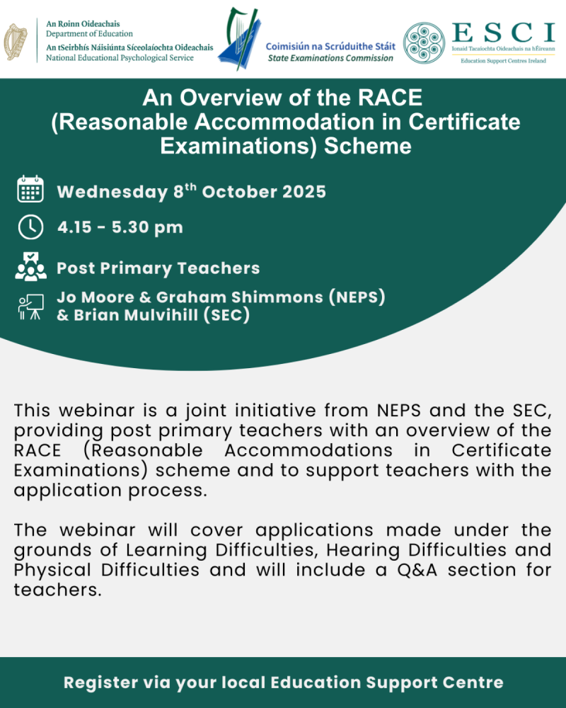 This webinar is a joint initiative from NEPS and the SEC, providing post primary teachers with an overview of the RACE (Reasonable Accommodations in Certificate Examinations) scheme and to support teachers with the application process. The webinar will cover applications made under the grounds of Learning Difficulties, Hearing Difficulties, Visual Difficulties and Physical Difficulties and will include a Q and A section for teachers.
