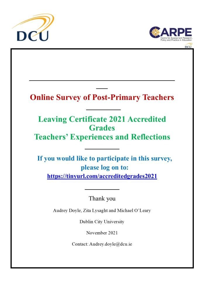 My colleagues, Dr Zita Lysaght and Professor Michael O’Leary, and I, from DCU, are carrying out a secondsurvey on “Teachers’ reflections on Assessment following their involvement in the Leaving Certificate 2021 AccreditedGrades Process”. Last year we gathered research on the “Calculated Grades” and the findings are found on the Carpe website at the following link: https://www.dcu.ie/carpeand in the article “High stakes assessment policy implementation in the time of COVID-19: The case of calculated grades in Ireland” 2021, Irish Educational Journal, Special Edition.