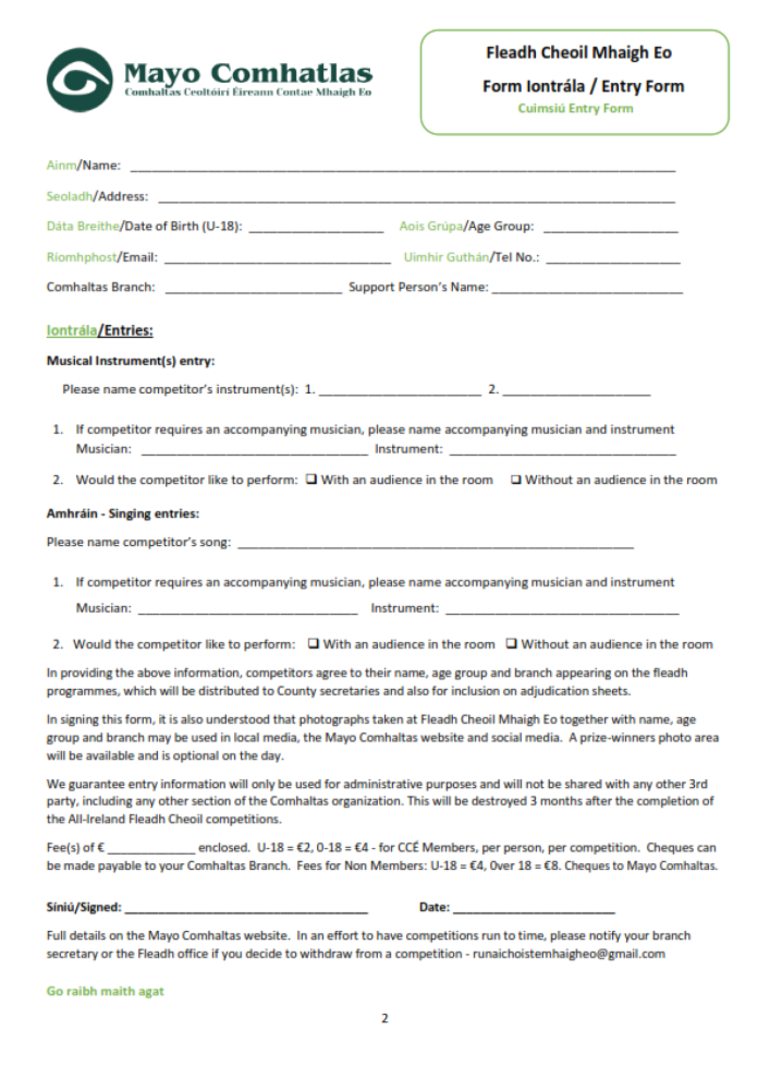 There are 4 Cuimsiú Competition age groups -: Under 12; 12-15; 15-18; Over 18 (Senior). An adult support person must accompany the competitor for the duration of the competitor's attendance at the Fleadh on Saturday 11.05.24 . Entries submitted by March 22nd, 2024, will be included in the Official Mayo Fleadh Programme Booklet 2024. Please see attached Entry Form, which is also available for download on Mayo Comhaltas Website https://mayocomhaltas.weebly.com/ Enquiries for the Cuimsiú Fleadh Competition to (087) 4185055.