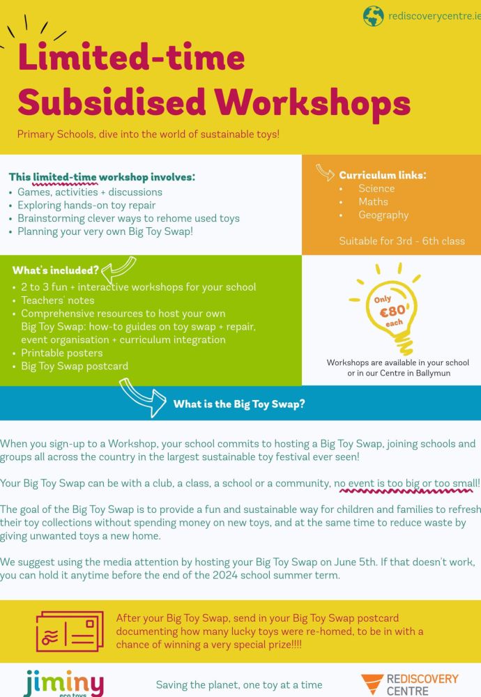 The Rediscovery Centre has teamed up with Jiminy Eco Toys to create the largest sustainable toy festival ever seen in Ireland: the Big Toy Swap! As part of the Big Toy Swap, Jiminy and the Rediscovery Centre are running 100 fun and interactive workshops for primary schools and youth groups across Ireland.