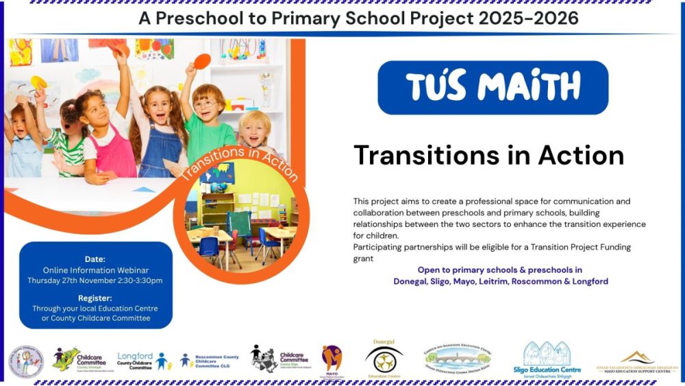 Participating partnerships will be eligible for a Transition Project Funding grant. Open to primary schools & preschools in Donegal, Sligo, Mayo, Leitrim, Roscommon & Longford.