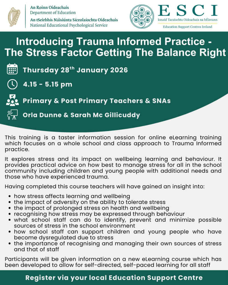 This training is a taster information session for online eLearning training which focuses on a whole school and class approach to Trauma Informed practice. It explores stress and its impact on wellbeing learning and behaviour. It provides practical advice on how best to manage stress for all in the school community including children and young people with additional needs and those who have experienced trauma. Having completed this course teachers will have gained an insight into: • how stress affects learning and wellbeing • the impact of adversity on the ability to tolerate stress • the impact of prolonged stress on health and wellbeing • recognising how stress may be expressed through behaviour • what school staff can do to identify, prevent and minimize possible sources of stress in the school environment • how school staff can support children and young people who have become dysregulated due to stress • the importance of recognising and managing their own sources of stress and that of staff Participants will be given information on a new eLearning course which has been developed to allow for self-directed, self-paced learning for all staff.