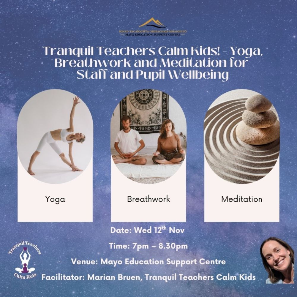 Marian Bruen is a primary school teacher with over 20 years teaching experience, she is also a Registered Yoga and Meditation Teacher. She is the founder of a supportive network for teachers, SNAs and Childcare Educators called Tranquil Teachers Calm Kids. She offers in-person Educator focused Yoga and meditation classes, training for Educational settings and Restorative Retreats specifically for Teacher and SNAs.
