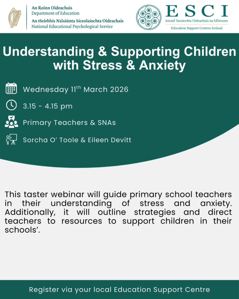 This taster webinar will guide primary school teachers in their understanding of stress and anxiety. Additionally, it will outline strategies and direct teachers to resources to support children in their schools’.