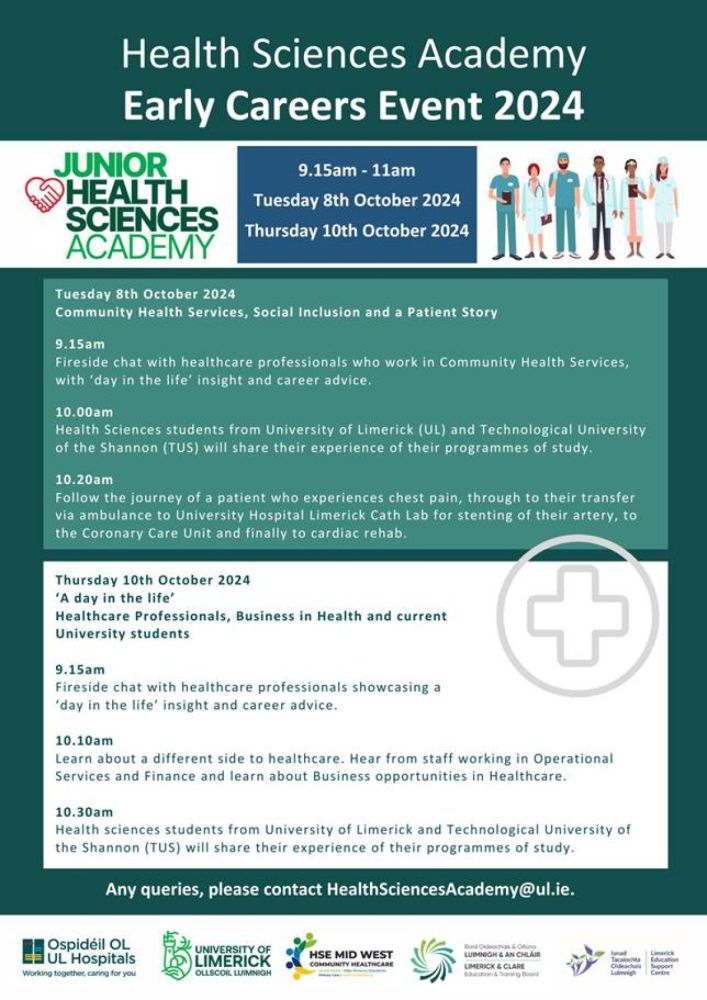 The event will be delivered via zoom each morning and we now invite students and teachers to register where they will hear from a wide range of healthcare professionals, learn about business in health, and hear from students from the University of Limerick (UL) and the Technological University of the Shannon (TUS) studying health and social care programmes.