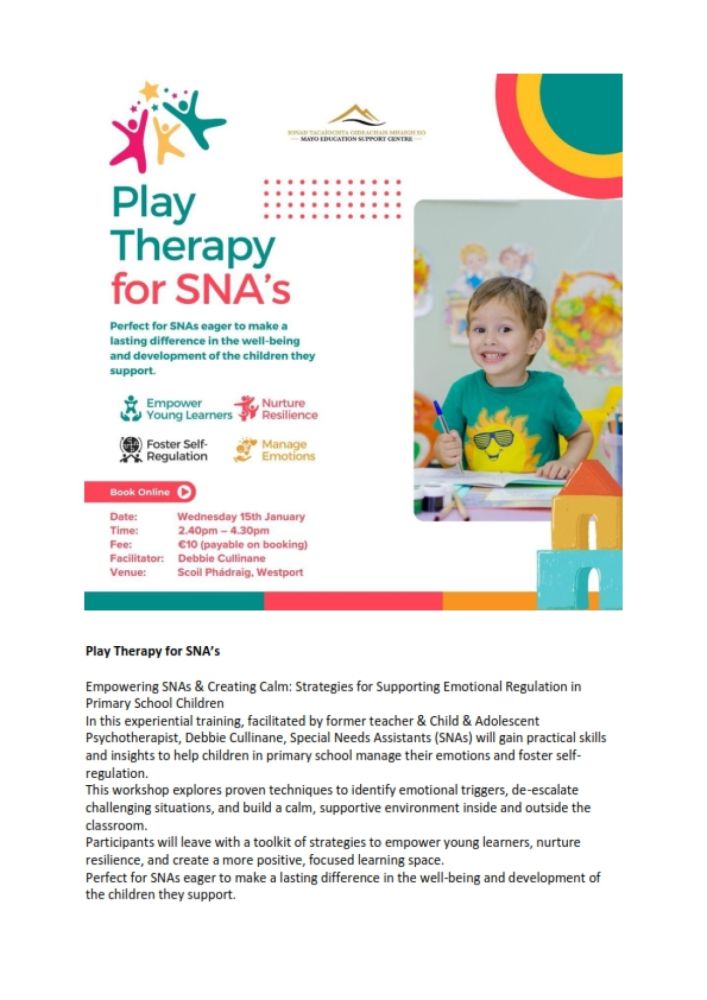 Posted in News Mayo Education Centre. Play Therapy for SNA’s Please find attached flyer with information re an upcoming face to face workshop in Westport for SNA’s